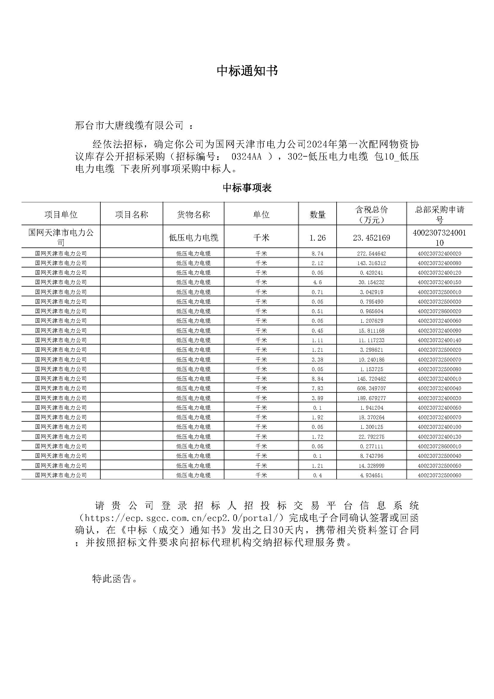 祝賀我公司于2024年在國(guó)網(wǎng)天津市電力公司2024年第一次配網(wǎng)物資協(xié)議庫(kù)存招標(biāo)采購(gòu)項(xiàng)目中成為中標(biāo)廠家 。中標(biāo)金額1533.95萬(wàn)元。感謝國(guó)網(wǎng)天津市電力公司一直以來(lái)對(duì)我公司的支持及認(rèn)可,我公司會(huì)以過(guò)硬的產(chǎn)品品質(zhì)和良好的服務(wù)態(tài)度,服務(wù)國(guó)家電力建設(shè)!